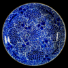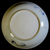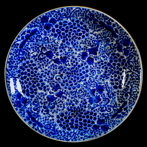 The charger is lightly potted with a bluish matte glaze and has a beautiful underglaze blue hand painted pattern of peonies on a frogspawn ground. Peonies are symbolic for wealth and honour; frog spawn for wealth and abundance… so serving your food from this charger must bring good luck! There are some sprigs along the rims on the underside of the charger.