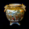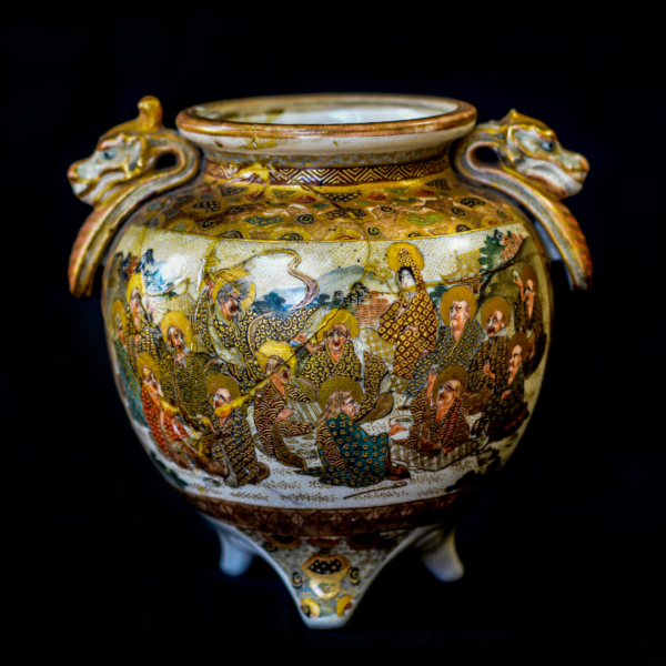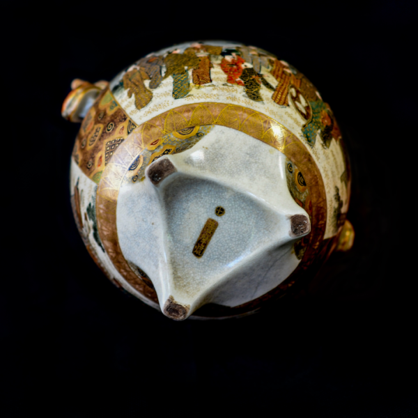 Satsuma earthenware tripod perfume burner with polychrome and gold enamel decoration. The body is decorated on one side with richly dressed figures representing royalty, and on the other with scenes of daily life by a river. The scenes are set against a rich floral and geometric background. Dragon-shaped handles. The piece is missing the lid. Signed under the base. Japan, Meiji period (1868-1912). This incense burner is a fine example of the Japonism that conquered Europe between 1860 and the early 20th century.