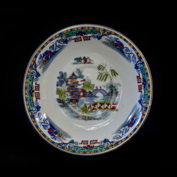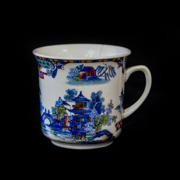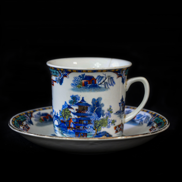 Unusual for its predominantly blue Willow pattern, this demitasse size coffee cup and saucer feature a colorful palette of yellow, green, red, etc. It’s perfect for enjoying a delicious cup of coffee.