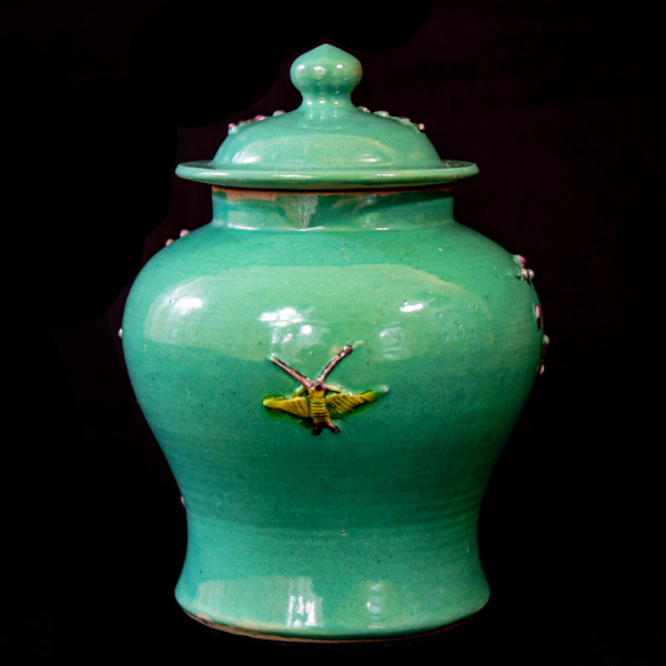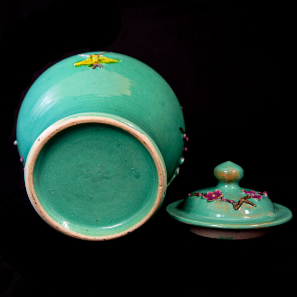 Turquoise-green pastel-colored plum blossom-patterned jar with lid.