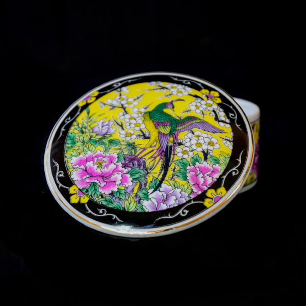 VTG Ornate Trinket Box Bird of Paradise Motif Hollywood CA Japan Made 2″ Round.