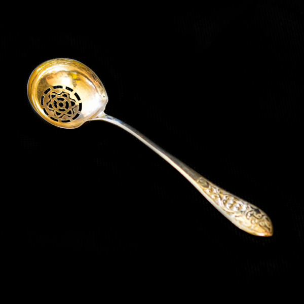 A very fine quality Victorian cast silver gilt Sugar Sifter Ladle with plain circular pierced bowl, the heavy gauge handle chased with harebell flowerheads and leaves, a female mask head terminal with oval concave back.