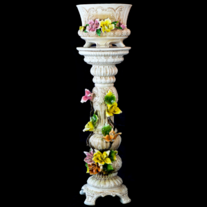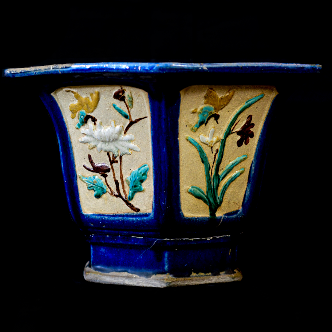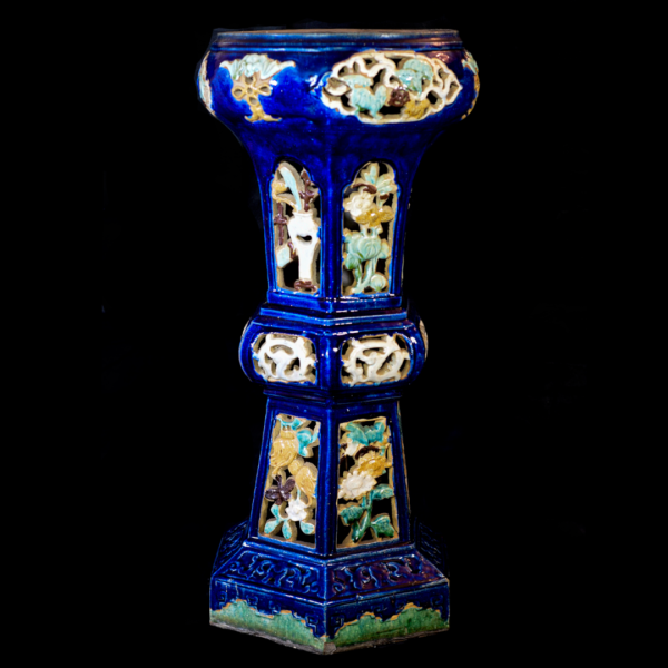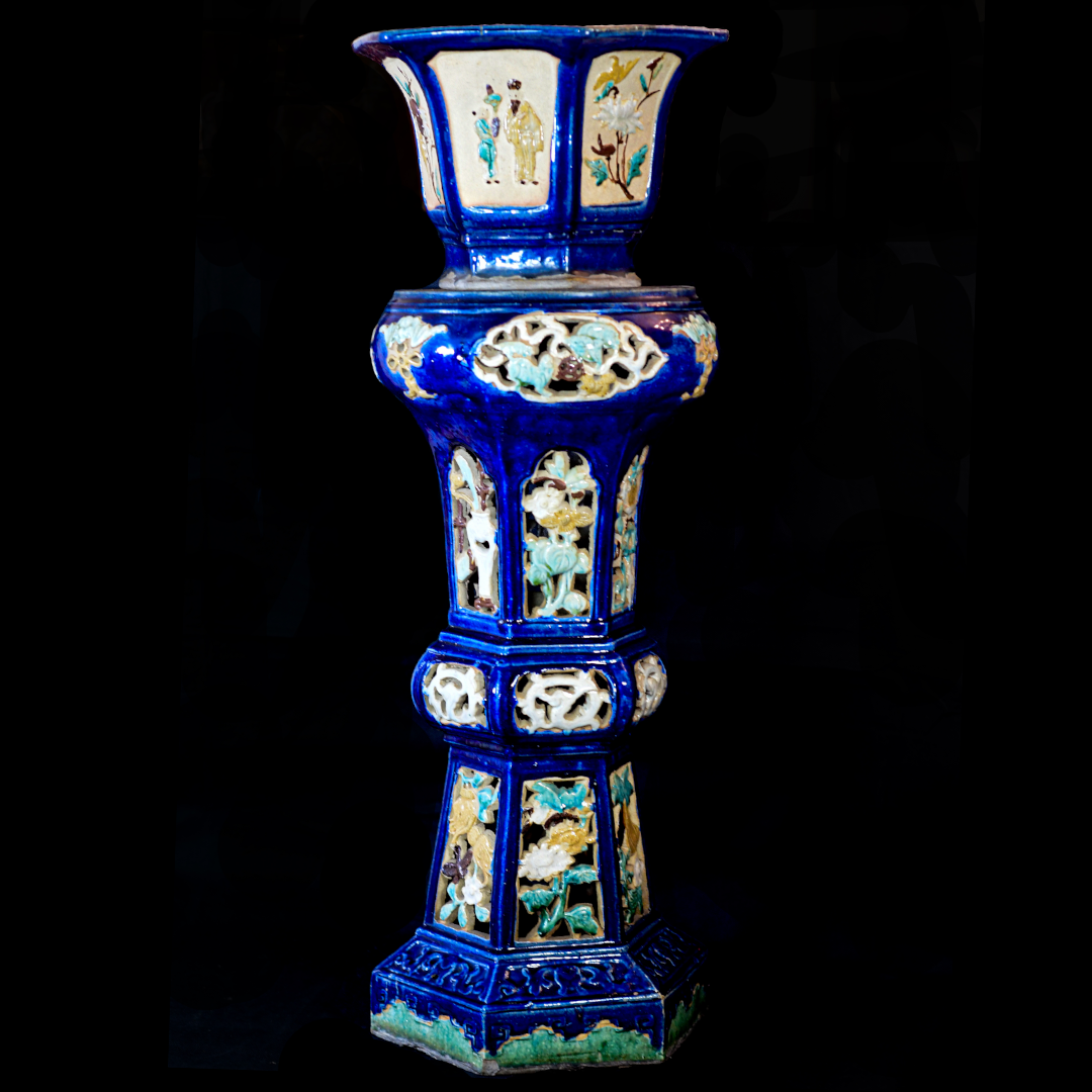 A LARGE EARLY/MID 20TH CENTURY CHINESE SHIWAN GLAZED POTTERY JARDINIERE & PEDESTAL STAND, the jardiniere with moulded panels, the stand with pierced decoration, 39.6in high overall, the jardiniere 16.25in wide from corner to corner.