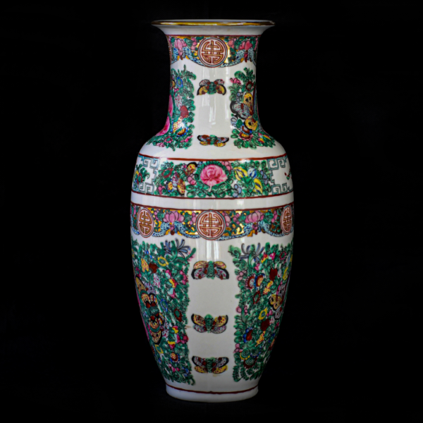 Beautiful large hand-painted Rose Canton vase, mid 20th Century, China. Pink roses, florals and butterfly designs accompanied by the Chinese symbol Lu, representing ‘prosperity’, ‘offspring’ and ‘son’.
