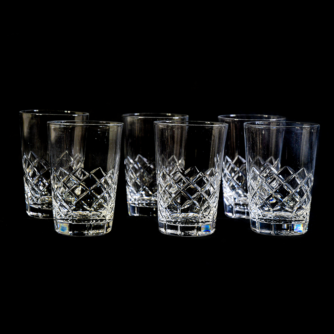 A beautiful set of crystal tumblers, with diamond cut detail and thick heavy base with vertical cuts.
