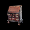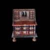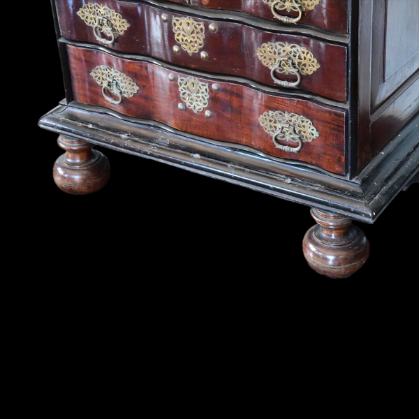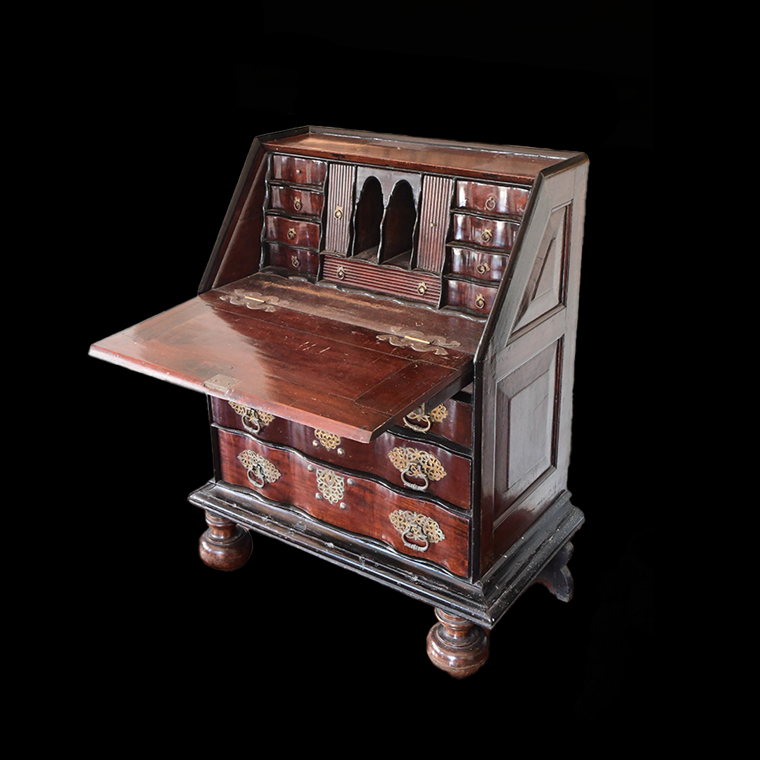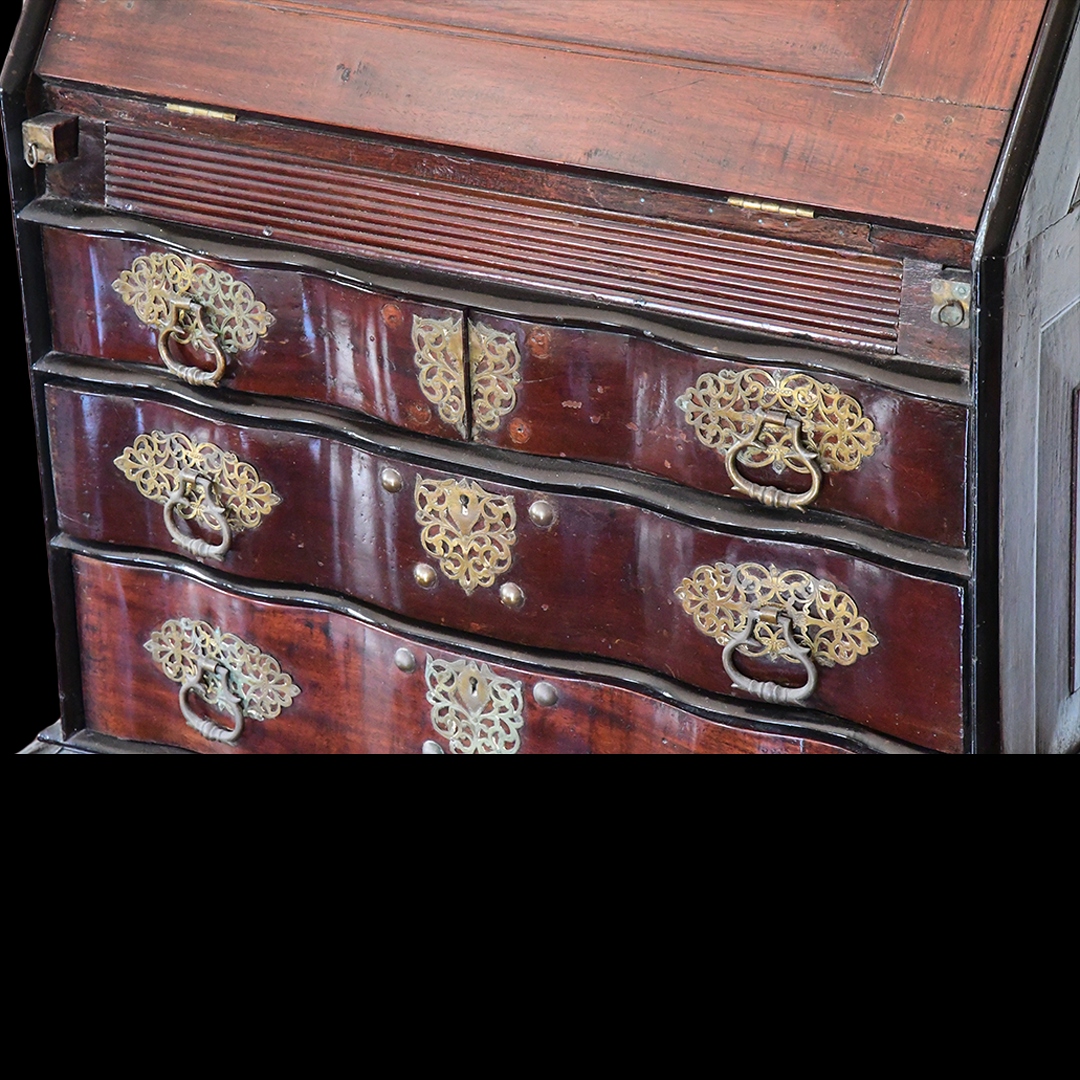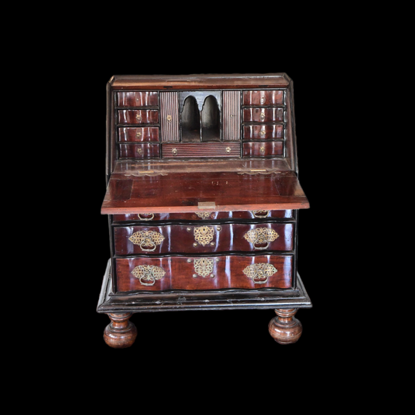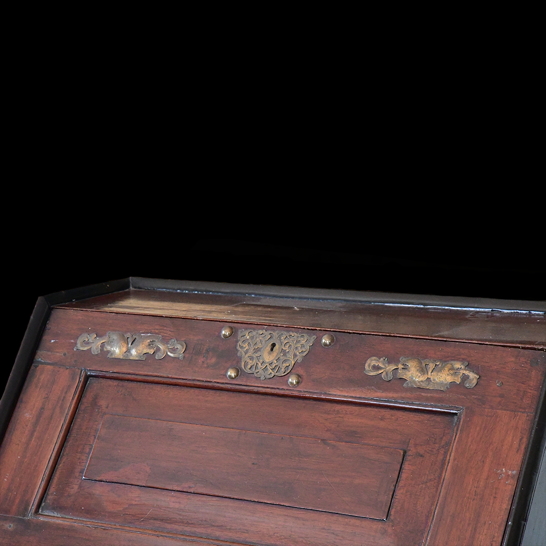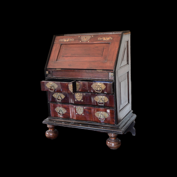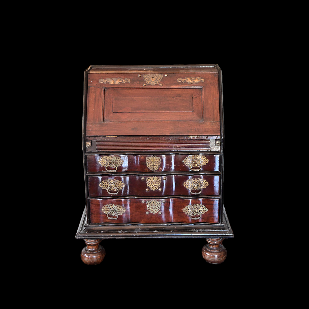 the panelled fall enclosing eight short drawers, four pigeon holes and one long drawer, above lopers with: ‘V.O.C’ carved to the centre, over two short and two long drawers, on a cavetto plinth base, with two later detachable baluster turned and stile feet, probably originally belonging to the Dutch East Indies company, 101cm wide, 51cm deep, 92.5cm high (39.5in wide, 20in deep, 36in high).