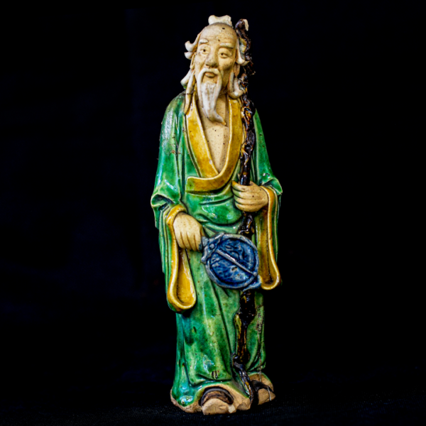 Hand made, hand painted, vintage/antique Chinese Mudman 4 1/4″ Tall. Very expressive gentleman holding a walking stick and some sort of instrument.