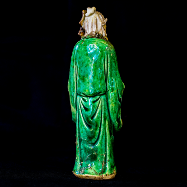 Mud figures all were handmade from light, dark or reddish clay. Since they were all handmade, no two figures are ever the same. Vintage mud men have holes in the clay for their eyes, ears, nose. Their faces, feet, hands, and any exposed skin is left in the natural clay form.Most older figures have a hole in the bottom of the base that extends up inside the figure. The artists used this hole to form or shape their work around their finger, hand, or stick and usually has the CHINA imprint(backwards). Vintage mud figures date for the most part from the 1900’s to the mid 1950’s. The smallest figures were used as backdrops in fish tanks, bonsai plants, or stand alone. They are fragile and many times have areas that are chipped or broken. This mudman has a chip on the walking stick-Typical Condition.”CHINA” is printed on the bottom. This mudman is in excellent condition.
